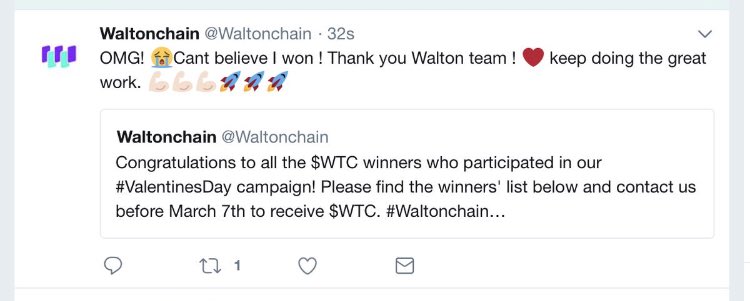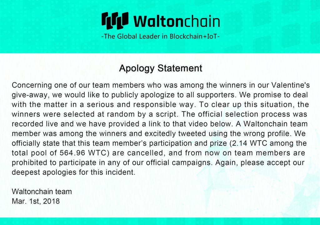 The Tweet in QuestionThe public at large immediately suspected that the giveaway was fraudulent, and that Waltonchain employees failed to switch accounts to one that would be a designated fake winner. In response to this event, Waltonchain released an apology other twitter which states that a Waltonchain employee participated in the giveaway and ended up winning.
