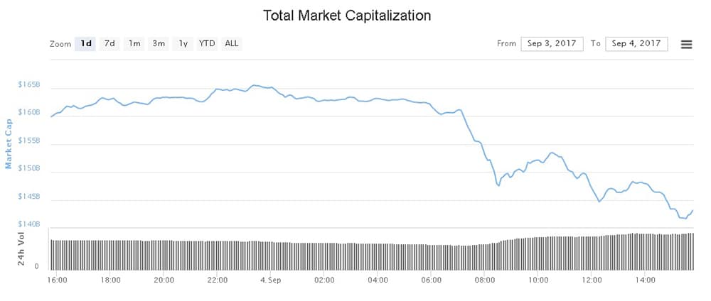 This was not restricted to these currencies but was felt across the board. The total market cap for all crypto currencies was seen falling from just over $165bn to $140bn now. This is clearly evident in the chart below from Coinmarketcap.