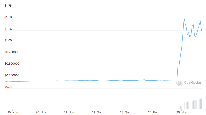 Following the news, the BRD token exploded, and may not be done yet. According to data from CoinGecko, BRD went from $0.16 to $1.51 in a matter of hours for a gain of 841%. Currently, BRD has cooled off slightly and is now trading at $1.30, but still looking very strong.