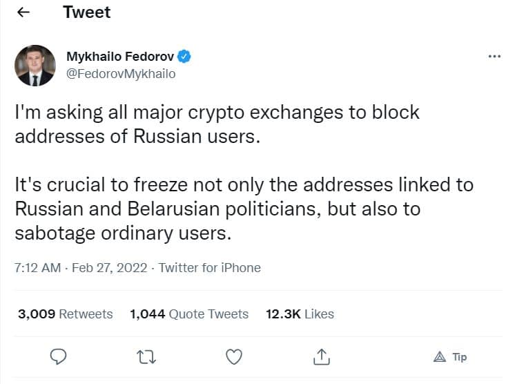 Ukraine’s Minister of Digital Transformation, Mykhailo Fedorov, took to Twitter on Sunday to ask that crypto exchanges block all Russian addresses. Not just the addresses tied to Russian politicians and officials, but also the addresses of ordinary Russians, in order to sabotage the economy of the entire country.