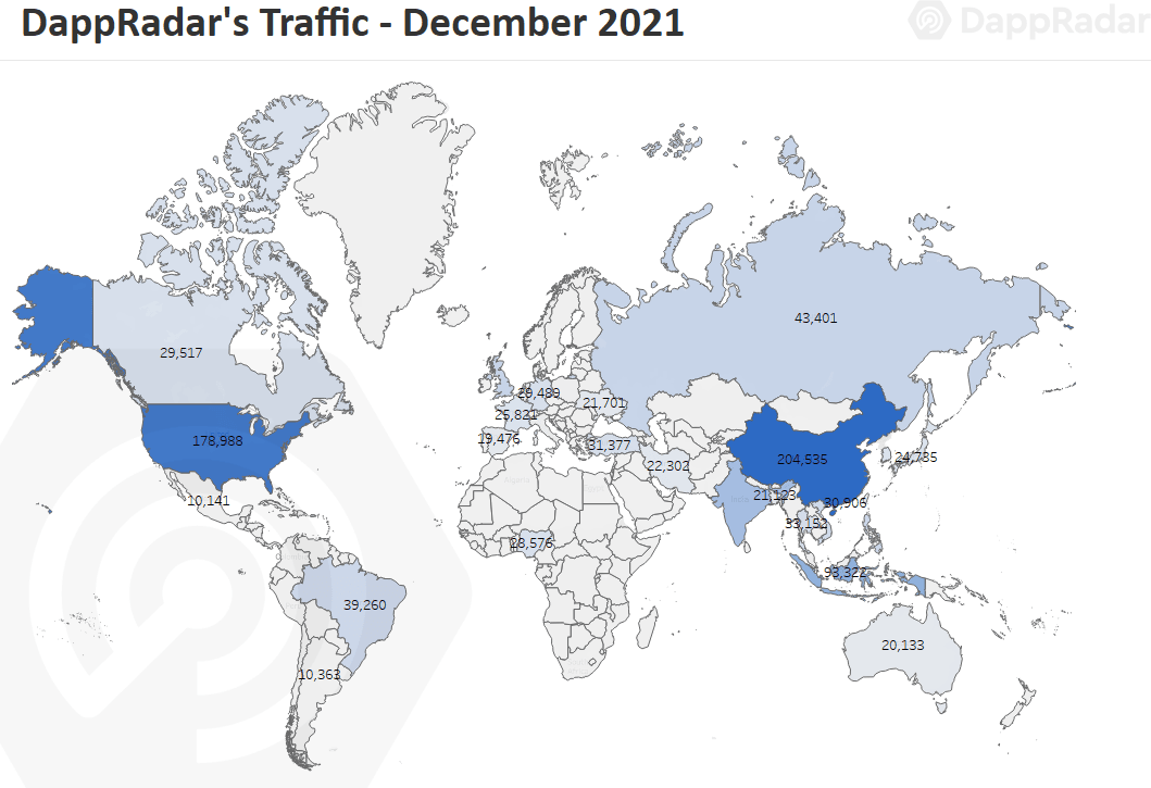 According to the research, Asia’s footprint is now the driving force behind the NFT user base and its adoption. The firm says China is now the country with most extensive user base with more than 204,000 people showing up in DappRadar’s traffic, a 166% increase from November. Traffic is also growing in Indonesia and India, with both countries doubling its numbers, according to the report.