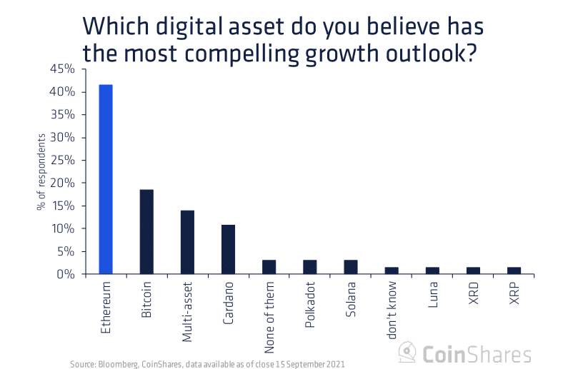 "42% of investors see Ethereum as having the most compelling growth outlook, and by a significant margin, outstripping Bitcoin at 18%. This mirrors the growth in assets under management (AuM) we have seen in Ethereum, where market share of investment products has risen from 11% at the beginning of the year to 26% today."