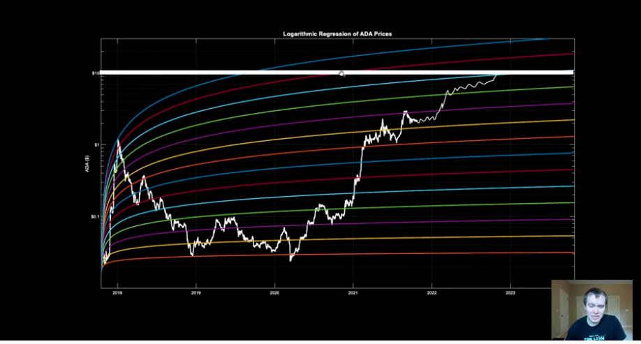 "A healthy way to get there would be a move up in a few months to maybe a $3.00 to $4.00 ADA, where we go down to support for a while, then maybe a move to like a $6.00 to $7.00 ADA half a year after that, and then a rally to $10.00 ADA. That would be a healthy way to get there. A more unhealthy way to get there would be... if we just rallied up at the end of the year going into early $2022 and let's just say we hit like a $9.00 ADA by the end of the year or by early next year. If we had a $9.00 by early next year, the we're looking at basically dropping down two regression bands and moving up probably too quickly for the market to sustain it in the short term and then we would probably get a sizeable pull back, maybe back to the current prices, honestly."
