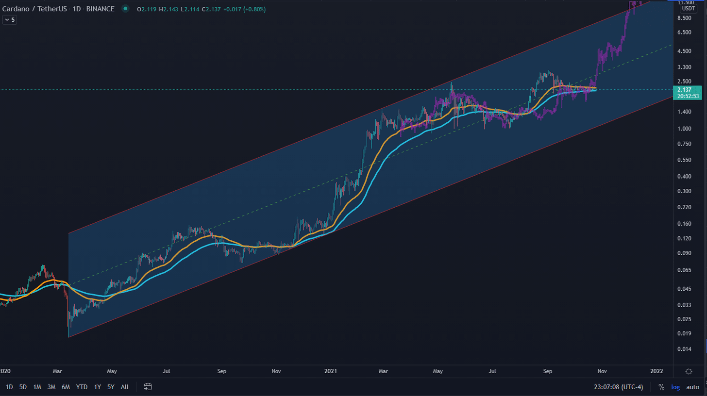 Other traders like Cardano Dan, think ADA has been in a giant ascending channel dating back to the COVID-19-induced crash on March 2020. Based on this thesis, ADA is still currently in the lower half of the channel with an upside target somewhere between $9.00 and $12.00 by early 20222.