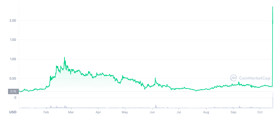 Another Ethereum token on the move is scaling solution Polygon (MATIC), which is currently up 20% on the day at the time of writing. Starting the day at $1.25, MATIC eventually made it up to $1.60 before correcting slightly. MATIC's rally came as news arrived that a Korean crypto exchange has announced support for the crypto, as well as smart contract platform Solana (SOL) and fellow Ethereum token NuCypher (NU). NuCypher printed an even more parabolic move on todays news, exploding from $0.28 up to $3.59 for a 1178% gain, making its yearly chart look rather dramatic.