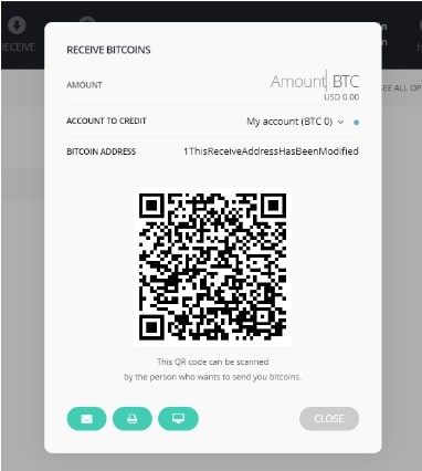 This can be seen in the image on the right as the individual is electing to receive Bitcoin. The address has been changed and the receiver may be duped into sending to the wrong address. Moreover, given that the wallet structure usually changes these addresses, they may not know this.