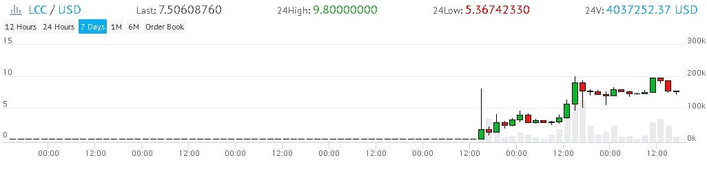 However, trading since then has been quite erratic and the token has rallied by as much as 690% to reach upwards of $9.28. This has since corrected slightly and LCC is now sitting at about $7.34. You can see the recent price swings in the below chart.