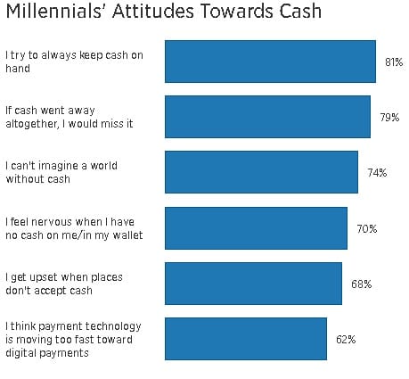What is indeed clear is that people still have a great attachment to cash. The simplicity of merely handing over a piece of paper that is universally synonymous with value is indeed hard to beat. As you can see from the image below, three quarters of respondents can't imagine a world without cash.