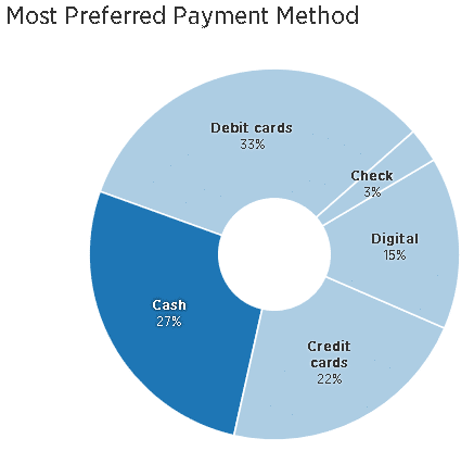 While no doubt true in the long run, according to recent survey, the majority of participants still favour cash as method of payment. In the survey, cash was only just behind debit cards as the preferred method of payment.