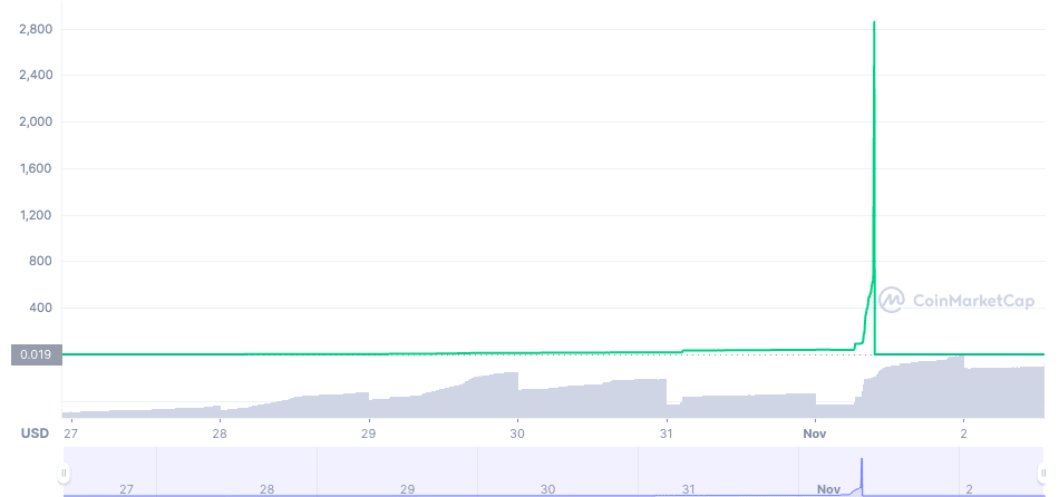 Hitting the market at $0.01 last Tuesday on decentralized exchange (DEX) PancakeSwap, SQUID rapidly skyrocketed roughly 75,000% to $2,861 in less than a week. Following some reports of investors not being able to cash out on on PancakeSwap, the price of SQUID went to zero in literally less than a second.