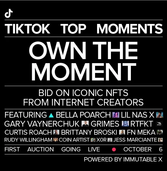 TikTokTikTok says that the NFTs will be a way for content creators to be rewarded for their material and for their fans to be able to have digital ownership over a "culturally-significant moment" on TikTok. Each one-of-one moments will be auctioned off while the limited edition NFTs will be released weekly until the end of October. Proceeds of from sales will given largely to the content creators and the NFT artists, according to TikTok.
