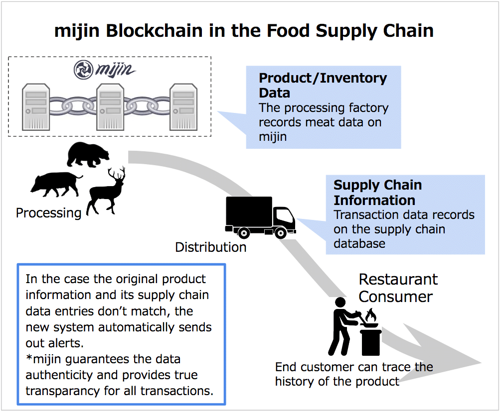 A division of the Japanese Ministry of Agriculture, forestry and Fisheries will use the blockchain to track the supply of this wild game meat. The Japan Gibier Association is in charge of the hunting standards for wild animals and for the distribution of their meat across japan. They are collaborating with a start up called Tech Bureau to use Mijin which is a blockchain that is based on the NEM protocol.