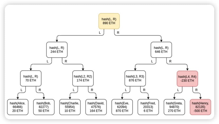 - Potential for mistaken or falsification of data- An exchange may have missed inputs, or could create false accounts with negative balances to alter total liabilities. The following diagram from Vitalik Buterin’s blog shows an example of how a Merkle Tree could be altered maliciously: