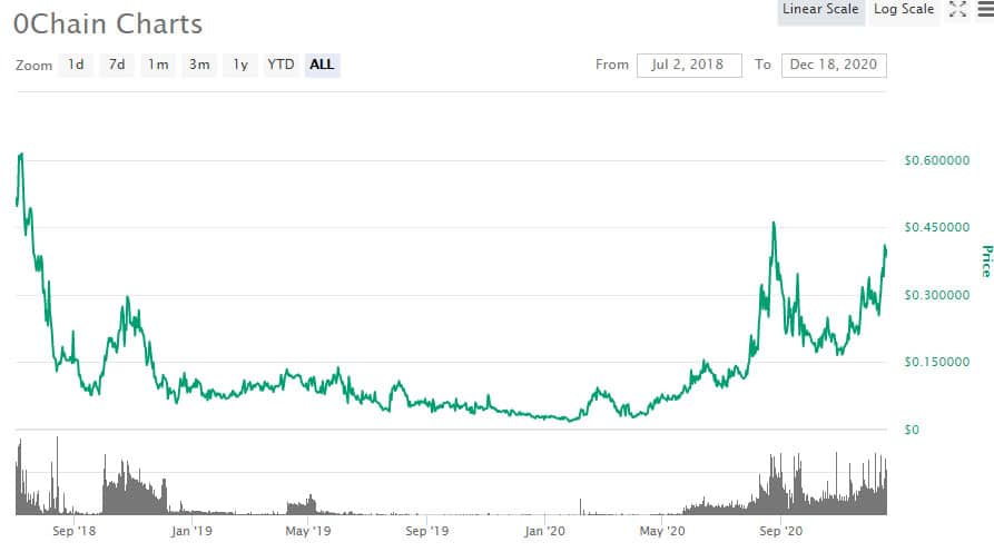 The only token who value is directly proportional to network usage. Image via 0Chain.net While the ZCN token is currently the 488th largest in terms of market cap, its price has performed well in 2020. In August 2020 the price moved as high as $0.45, although that remains shy of the early highs above $0.60 reached when the token first began trading in July 2018.