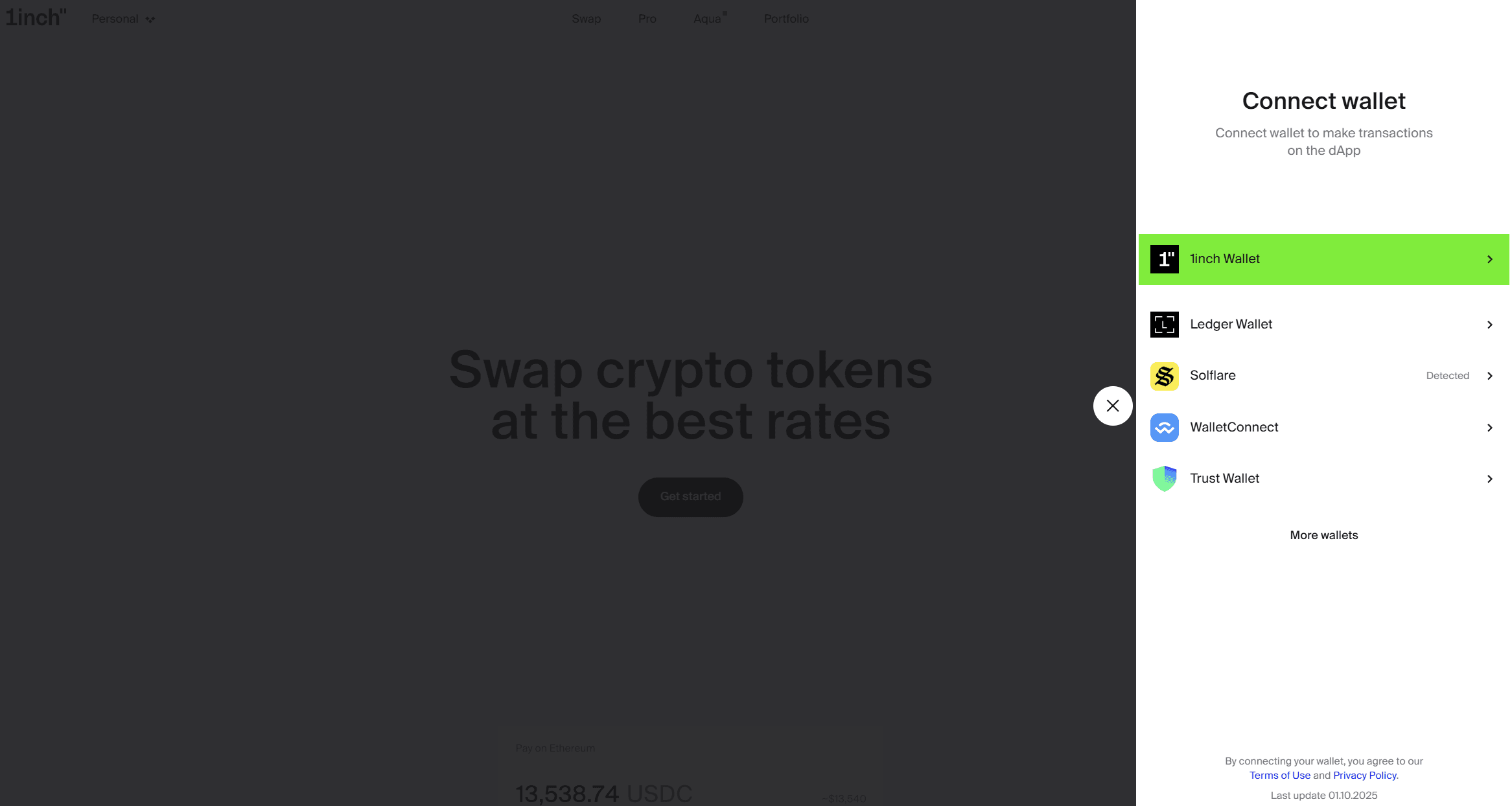 Beyond its own wallet, 1inch maintains broad compatibility. EVM users can connect through MetaMask and Rabby via injected providers. WalletConnect enables access from Ledger, Trezor, and Phantom for Solana. Coinbase and OKX wallets are supported, as are any wallets implementing EIP-6963. Hardware wallets can be used directly for cold-swap execution.