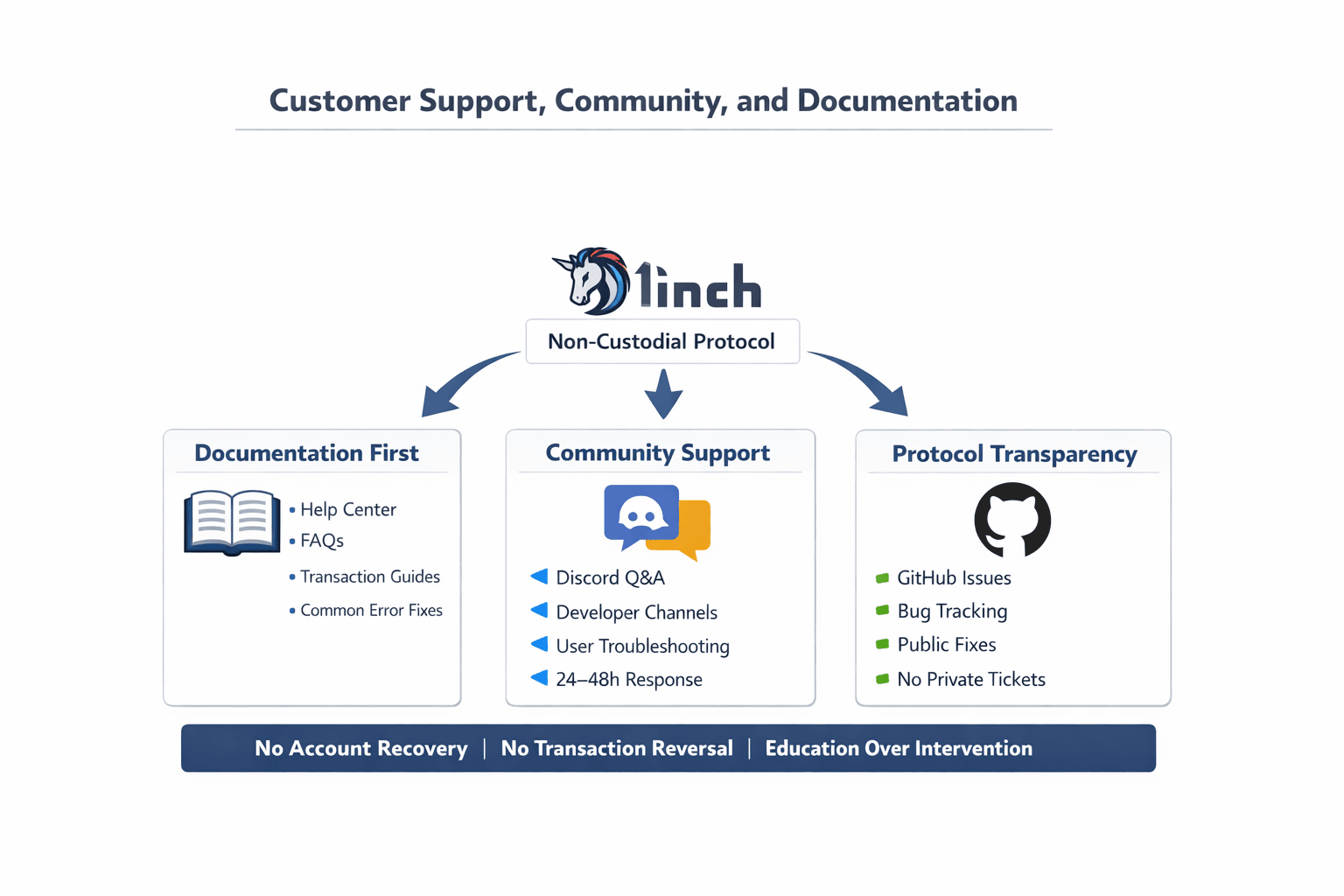 1inch relies on a layered support model centered on documentation and community rather than ticket-based intervention.