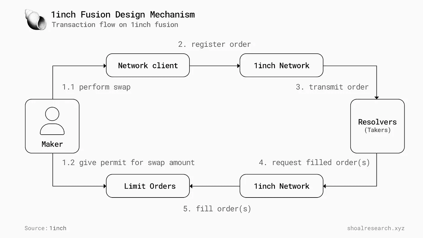 Transaction Flow of 1inch Fusion Swap Engine. Image via Shoalresearch.xyzThese resolvers, which are KYC’d professional fillers, participate in Dutch auctions that start with higher fees and descend until a resolver accepts the trade. This structure enables zero upfront gas costs with refunds on failure, partial fills when liquidity is fragmented, and execution through private mempools that reduce sandwich risk. In certain cases, resolvers can even source off-chain liquidity from CEX or OTC desks when pricing justifies it.