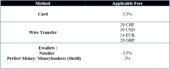 24option will not charge you any fees for sending money in although they will charge you for withdrawals. We were quite surprised to see how high some of these fees are and they are presented below: