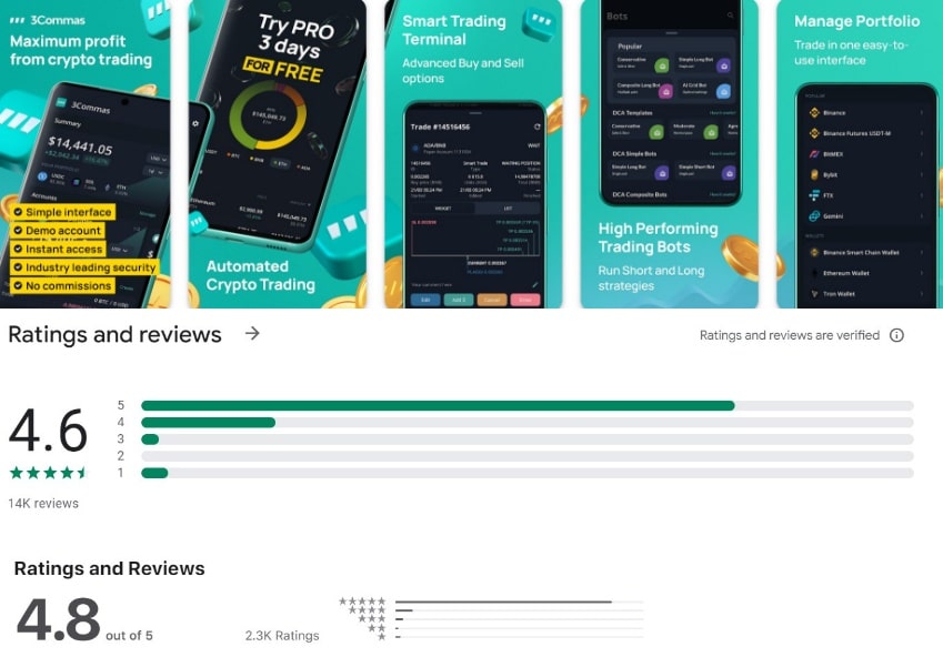 Rating Images via Google Play and App StoreThe 3Commas team have done a great job creating a high-quality platform with loads of features in a beautifully and simply designed platform. The reviews speak for themselves.