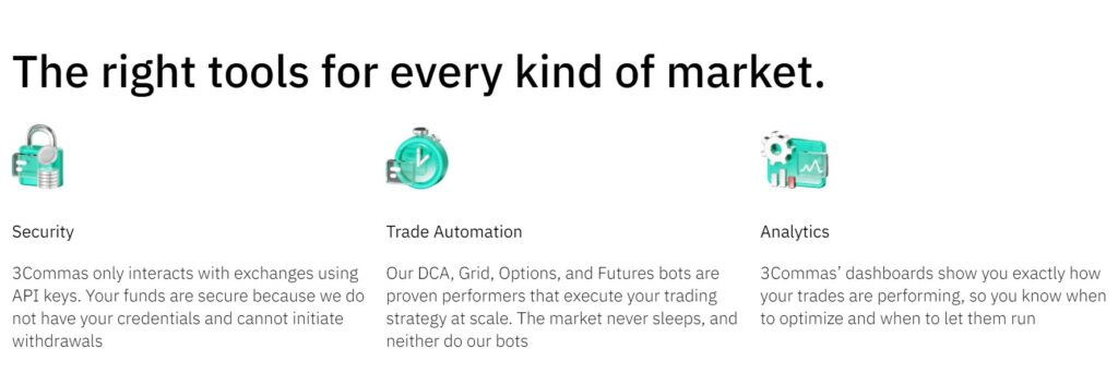 A Look at the 3Commas Homepage3Commas trading bots can connect to crypto exchanges like Binance, OKX, Bybit and more, and provide traders with a more advanced level of functionality for manual traders, or automated strategies and copy trading for traders who are looking to put their trading on autopilot.