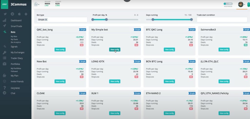 Here traders can purchase trading setups of other 3Commas bots after checking out their historical performance. Each bot has its own strategy and risk profile for the trader to choose from.