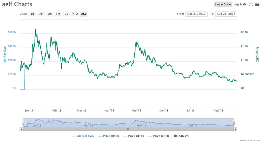 ELF Token Performance on CoinMarketCapSince then the token saw another spike to just over $2 at the end of April 2018. Since then it has slowly and steadily been falling along with the broader market and as of August 21 is trading at just $0.35 a token.