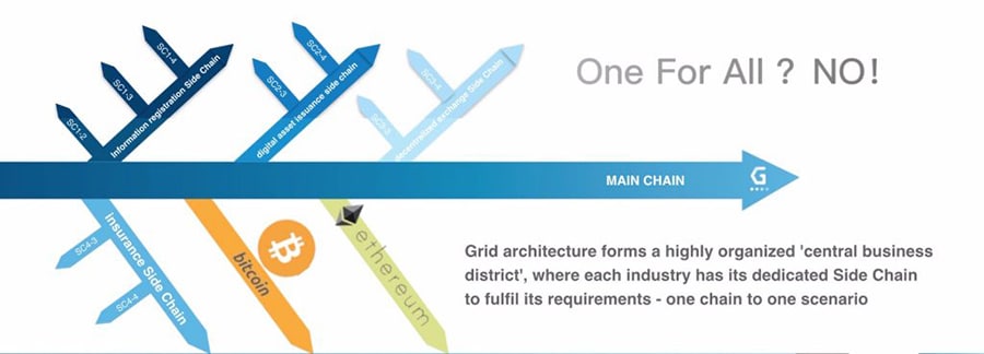 Aelf will have a main chain and many side chains that are used to run smart contracts. The main chain is of course the backbone of the entire network, but it is also able to interact with each side chain. The side chains are individually dedicated to a specific smart contract, and they cannot interact with each other. Instead they transmit information by communicating through the main chain.
