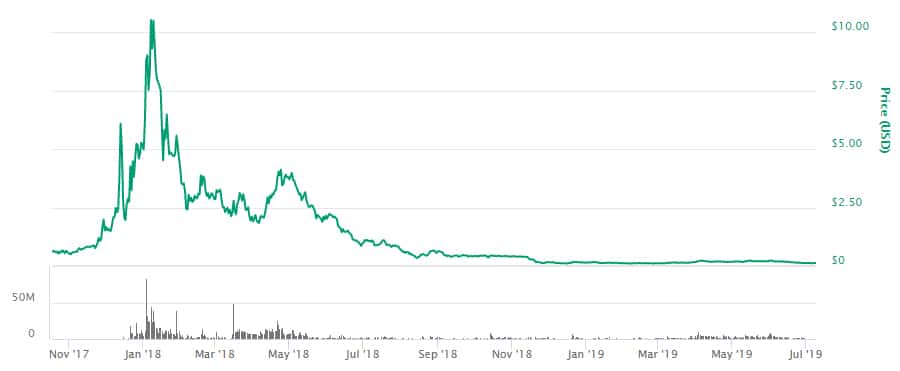 There was a recovery following the drop, which lasted for a month and took the token back to above $4.00 briefly before it began a slow slide throughout the remainder of 2018 that ended with the token finally hitting an all-time low of $0.104253 on February 6, 2019.