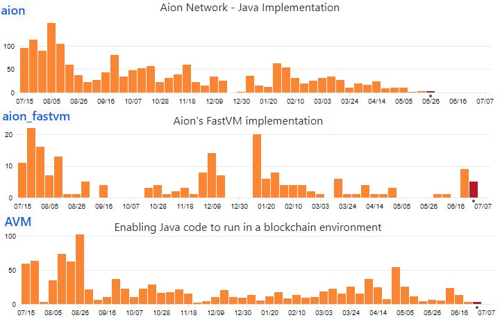 Hence, I decided to move on over to the Aion GitHub to get a better sense of exactly how much code is being pushed by their developers. In the below we have the code commits for their three pinned repos.