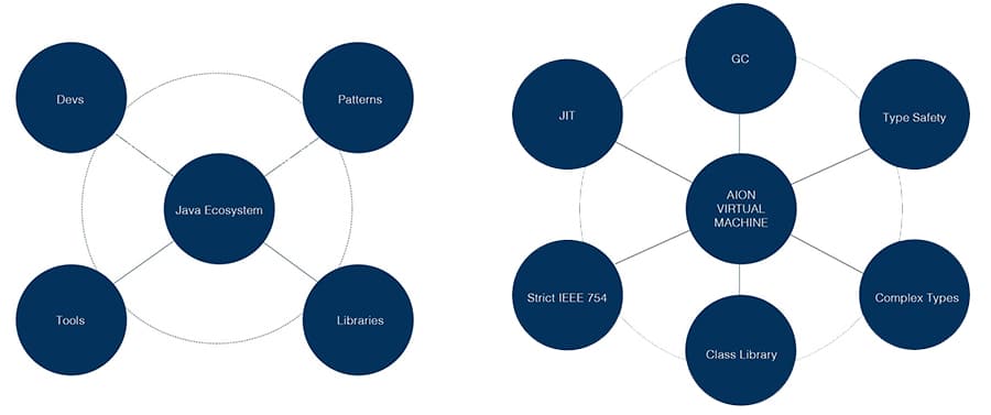 Java Ecosystem (Left) & the Aion Virtual Machine. Image via Aion BlogJava was chosen to provide performance and robustness to the network. Based on the Ethereum Virtual Machine it is 128-bit and is the next step towards a more robust ecosystem of interchain dApps.