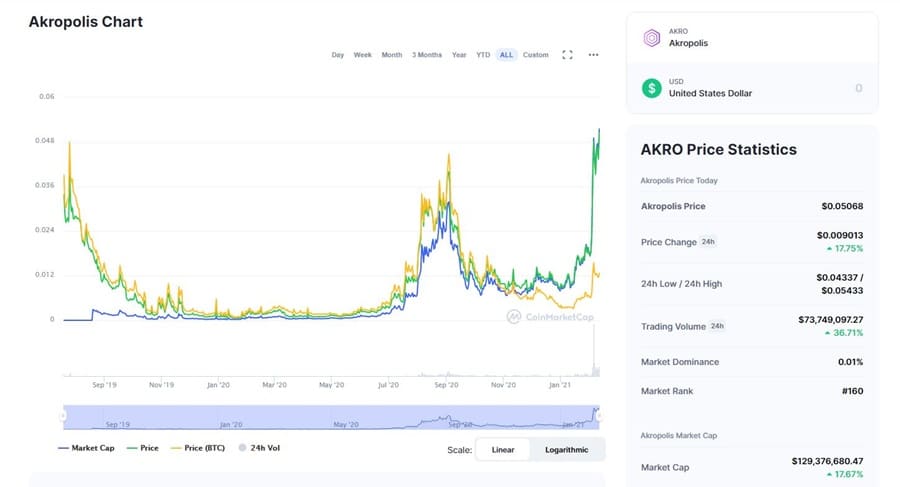 The AKRO token underwent a private sale in 2018 where tokens were sold for $0.014 each, and then a public IEO on Huobi Global in July 2019 where tokens were sold for just $0.005 each. Either way it’s been a good investment as the AKRO token is currently worth $0.05125 in mid-February 2021.