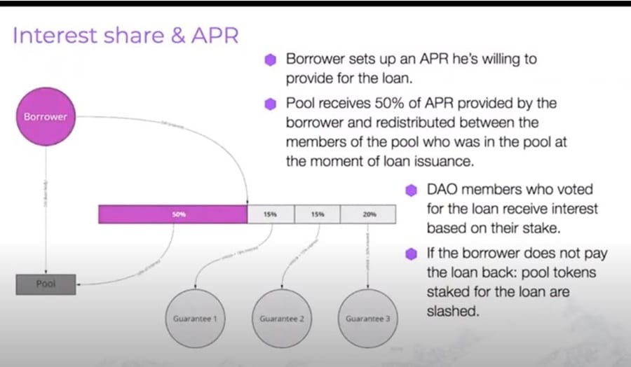 This is a DeFi equivalent of cashflow financing, with a chief goal of helping companies get investments without having to jump through the myriad hoops that exist with traditional centralized platforms. Projects can get funds directly from investors, accelerate their growth and pay it back as they grow.