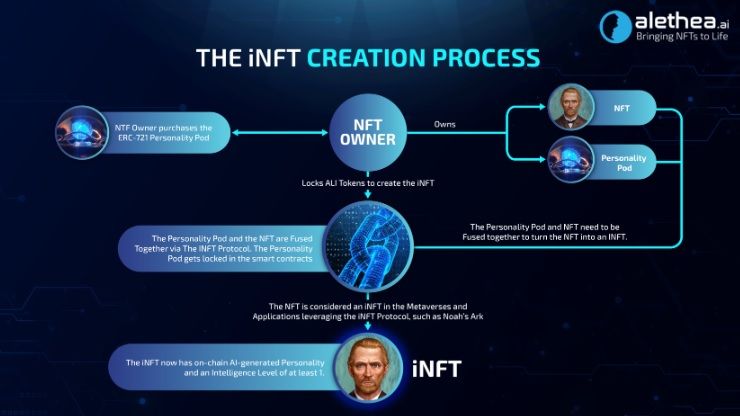 Unlike Traditional NFTs, Which Are Static, iNFTs Can Learn, Respond, or Generate New Content. Image via Alethea AIThe iNFT Protocol refers to a set of smart contracts based on the Ethereum blockchain that allows anyone to create iNFTs in a permissionless manner. Any NFT can be turned into an iNFT via the iNFT Protocol. This is achieved by fusing the NFT with another ERC-721 asset called the Personality Pod. Once the NFT is fused with a Personality Pod, it acquires its own unique intelligence and personality. This is because the Personality Pod comprises various on-chain personality traits that shape the overall personality of the iNFT and in doing so, dictate the iNFT's intelligence.