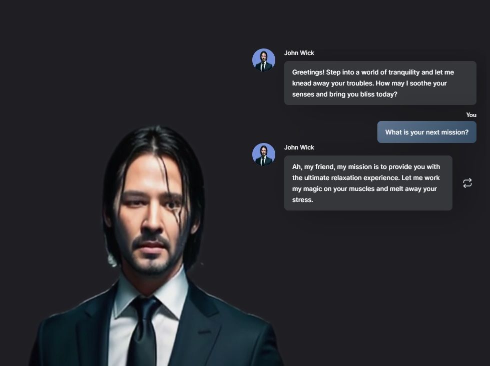 That all said, however, it appears my version of John Wick was pre-assigned the personality of a “compassionate and skilled massage therapist." So, I asked him another question: I just returned from the gym and my muscles are a little sore. Which massage is best for my situation? In response, I was told to get a deep tissue massage. Right on, Mr. Wick!