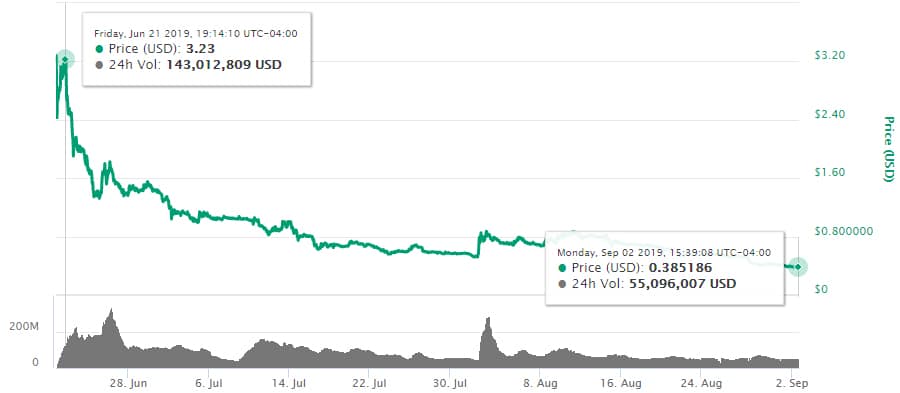 ALGO Price Performance. Image via CMCUnfortunately for those who participated in the ICO, the token has not held up well over the summer. As of September 1, 2019, ALGO is priced at $0.393337, which still puts the token in 47th spot based on a market capitalization of $113 million.