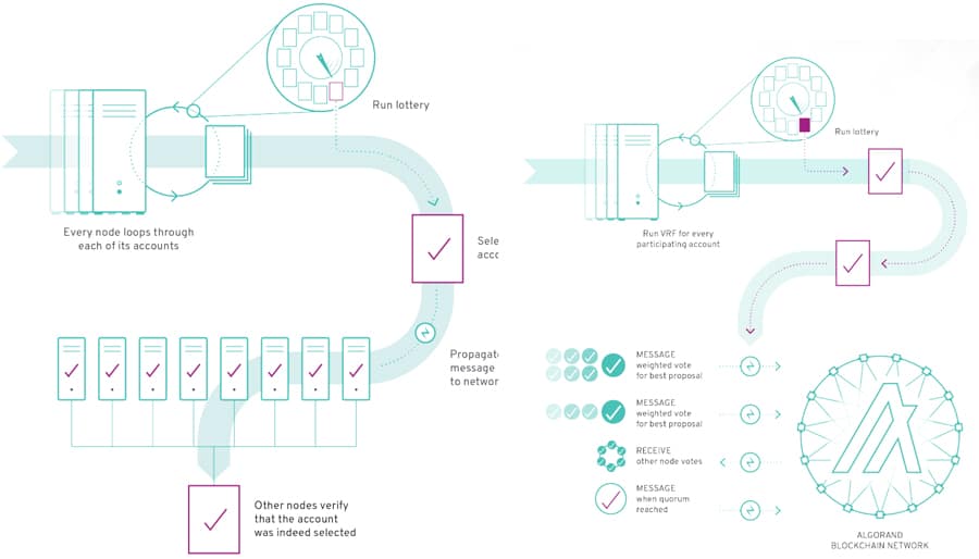 In order to scale this to a large number of network nodes, Algorand has developed a unique mechanism based on Verifiable Random Functions. This solution allows a participant to check privately and see if they have been selected to participate in agreement for the next block, and then include proof of selection in their network messages.