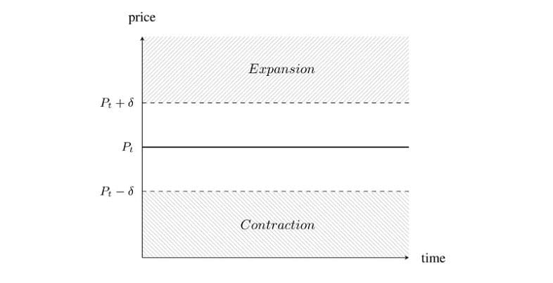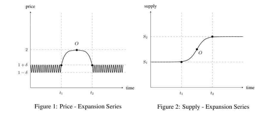 Graphs showing the expansion period when demand for AMPL increasesIf the price of AMPL is greater than 1.06$USD, the supply will increase and if it is lower than 0.96$USD then the supply will decrease. These two states are referred to as expansion and contraction, respectively. Expansion or contraction continues until the market price per AMPL token settles within the equilibrium range.