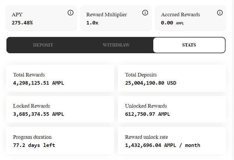 Statistics about staked and issued funds in the Ampleforth GeyserTo use the Ampleforth Geyser, you must deposit an equivalent USD amount of Ethereum as the AMPL tokens you are depositing. You will receive a slow drip of UNI-V2 LP tokens (Uniswap V2 tokens), which will then need to be staked in the Ampleforth Geyser to receive your AMPL token rewards.