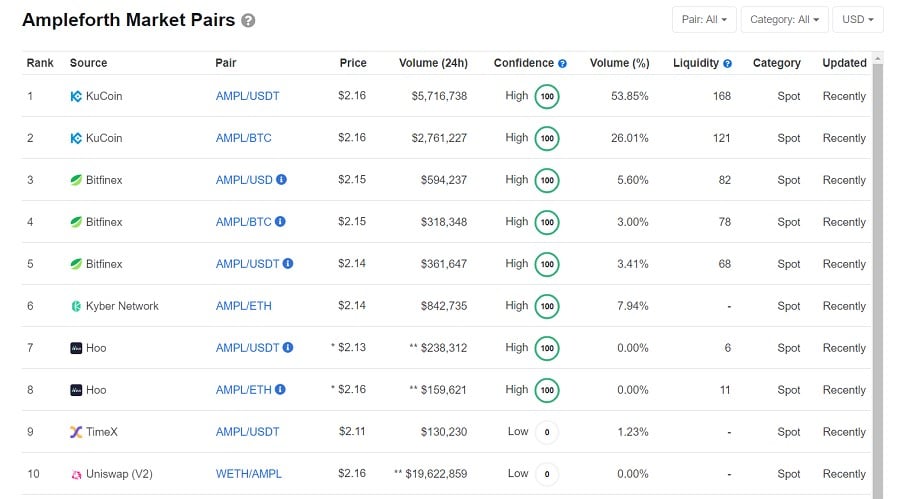 The second is explained by the fact that many people are taking advantage of the Geyser rewards and staking their AMPL on Uniswap – stakeable cryptos often have low 24-hour volumes.