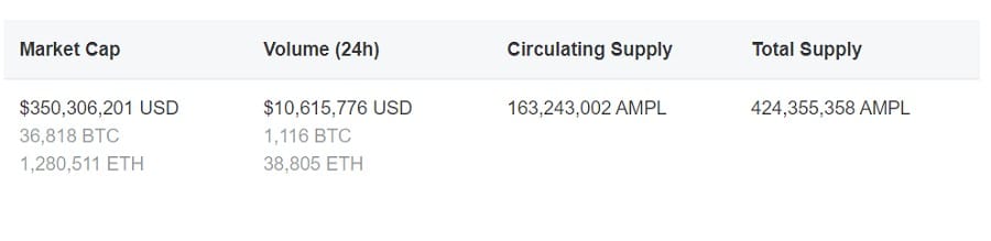 Ampleforth’s 24 hour volume vs. its market cap. Image via CMCIt is also briefly worth nothing that not many AMPL tokens are in circulation compared to its total supply, nor is the 24-hour volume significant compared to its market cap. The first is explained by the allocation of the initial 50 million tokens, of which the recipients continue to hold a large percentage of AMPL’s fluctuating supply.