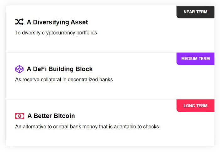 The first is as a cryptocurrency which is truly uncorrelated to Bitcoin and the second is as a stable store of value within DeFi applications. Ampleforth is not backed by anything, making it a more feasible long-term alternative to crypto-backed stablecoins like DAI and possibly even fiat-backed stablecoins like Tether.