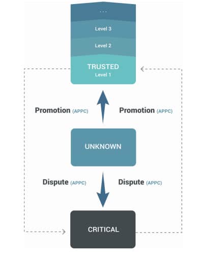 This all operates on AppCoins "chain of trust". There are three different reputations for the developers in the ecosystem: