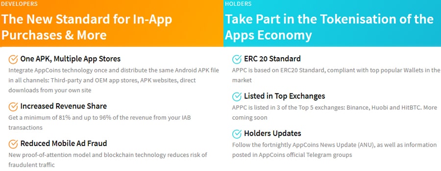Benefits for developers and holders of AppcoinsThe project isn’t interested in building any distributed apps itself, instead, it seeks to add a decentralized solution, and add its token as a payment option for in-app purchases. Its success or failure hinges on convincing users and other app stores that its solution is the best for all involved.