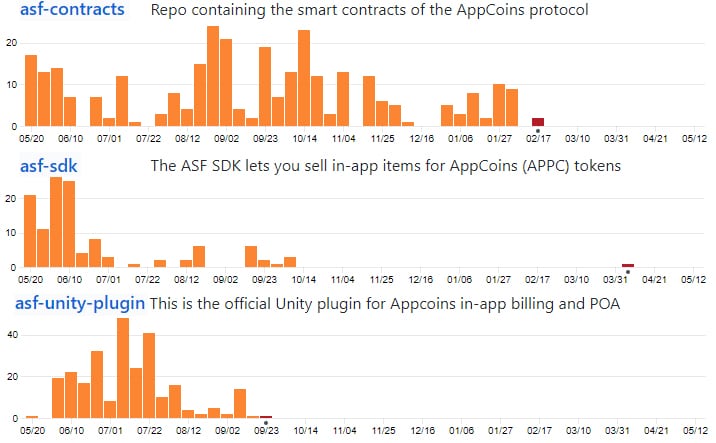 Hence, I decided to jump into the GitHub for the AppCoins project. These repos are all hosted in the App Store Foundation's GitHub. There are a total of 15 repositories but below are the commits for the 2 most recently active.