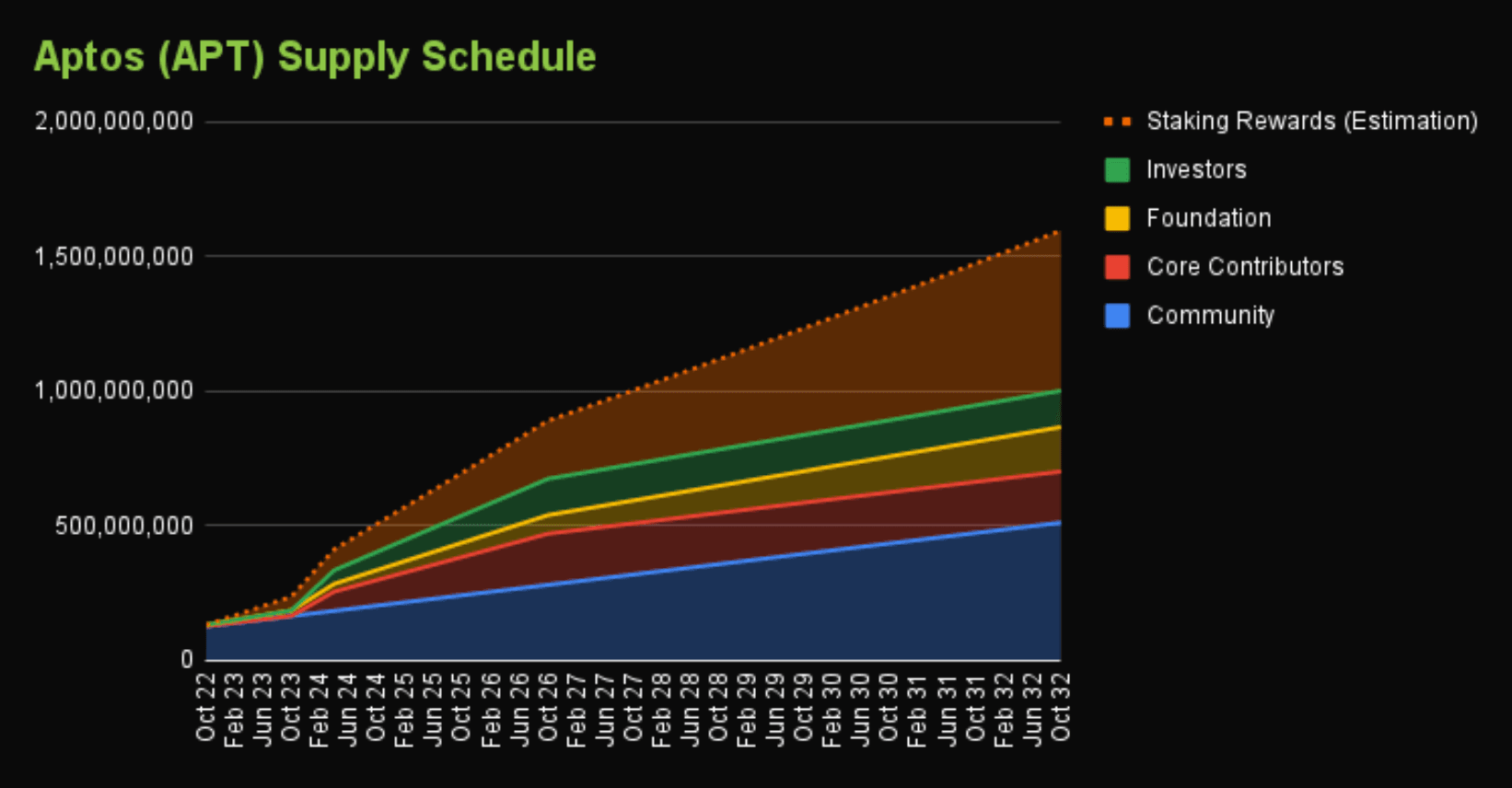 The Aptos Foundation and the community token allocation will fund community growth initiatives like grants and incentives. About 125 million APT was made available initially to support ecosystem projects and the Aptos Foundation. The remaining tokens will unlock monthly over the next ten years. Here is a look at the vesting schedule: