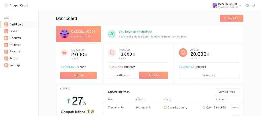In the Aragon Court, all parties who want to participate as jurors, plaintiffs, or defendants must put down a minimum stake of 10 000 ANJ tokens (more on this in the next section). A plaintiff must wager stake to take an issue to ‘court’. If the defendant does not respond within a certain timeframe, the plaintiff automatically wins, and the defendant loses his or her stake.