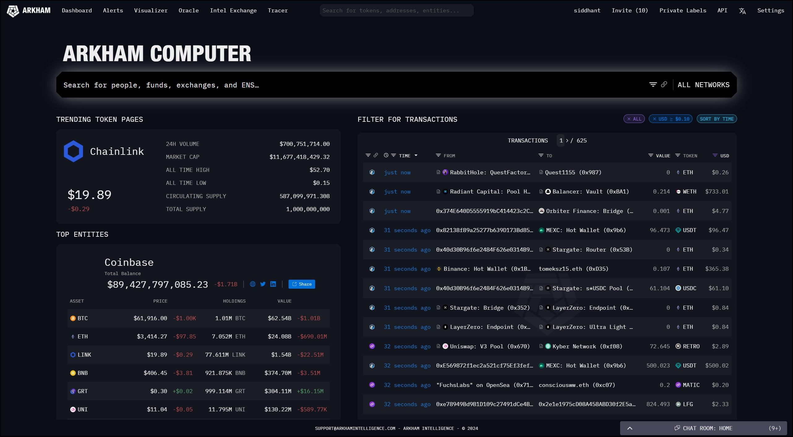 Arkham renders its services via a public web-based application. The Arkham Platform is intuitive to use and, in design, reminiscent of stock analysis platforms like Bloomberg markets. If you open Bloomberg markets, the homepage includes links to relevant headlines, displays prices of the most traded stocks and commodities, and provides access to additional features like price charts within a few clicks. Quite similarly, the Arkham platform homepage summarizes the latest transactions across different networks, displays trending assets, and lets users search for anything or anyone with a few clicks.