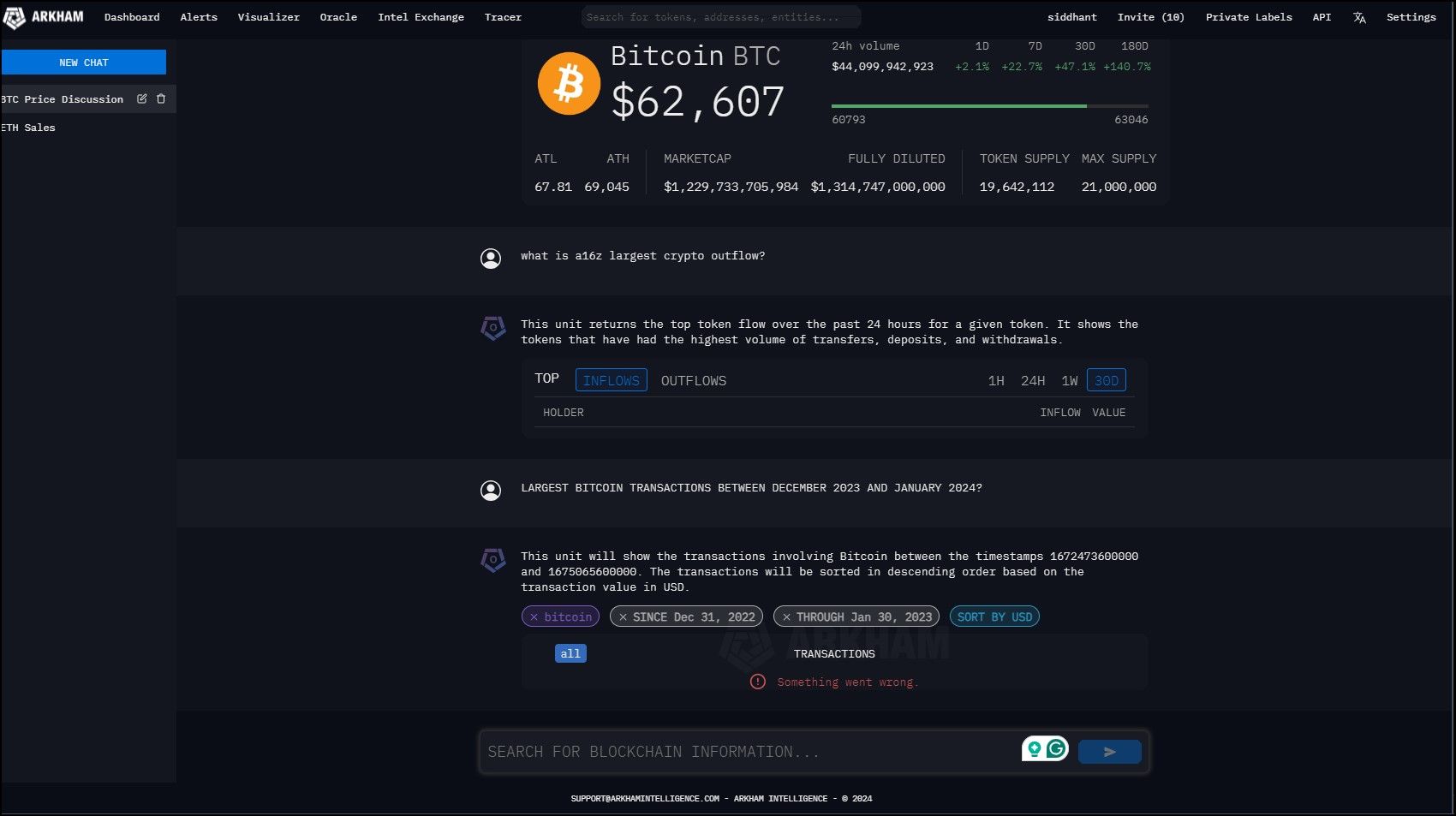 Arkham OracleWhile the pace of innovation in AI has been faster than ever, Arkham’s Oracle is a miss at this point. The Oracle is an insanely cool idea on every account, but it did not work as expected despite multiple attempts (see above image). However, prompt-driven AI tools have been all the rage in this market cycle, so I anticipate Arkham to improve its Oracle response in due time.