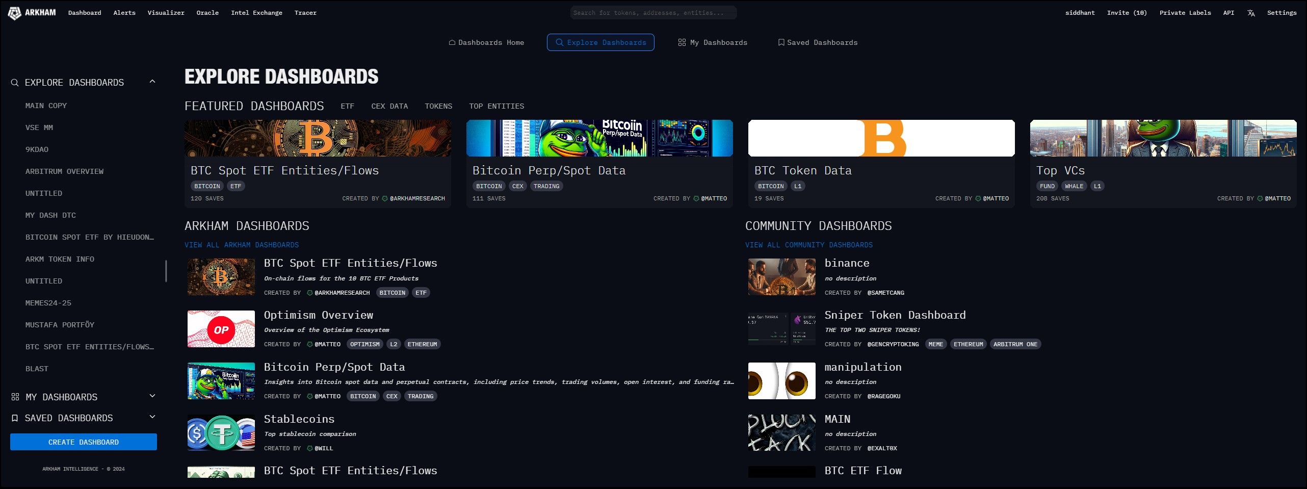If you hit the ‘Explore Dashboards’ option on the Dashboards page, you'll find countless dashboards spanning several data areas. Investors with any trading style will find useful dashboards here, curated by the Arkham team and the community.
