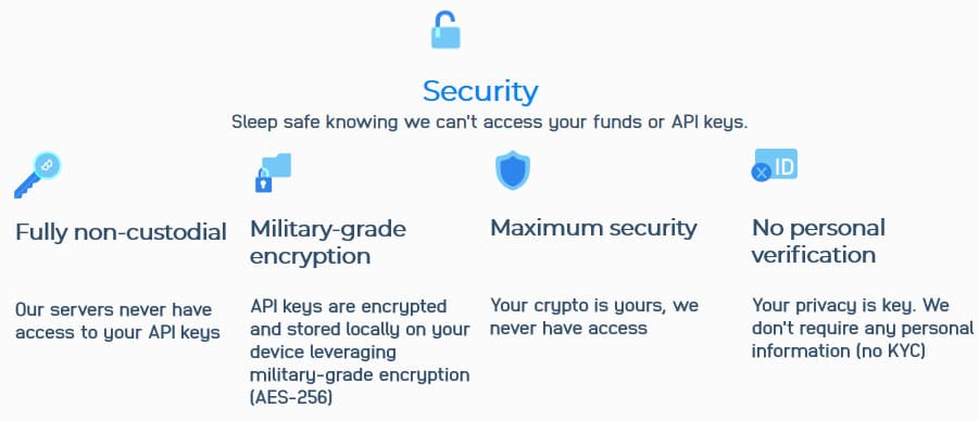 Some Atani Security Features. Image via Atani Because Atani is a non-custodial platform it means that your funds are never at risk, even if Atani itself is breached by hackers. In addition, the company uses military-grade AES-256 encryption to protect the APIs that are stored locally on your own PC.